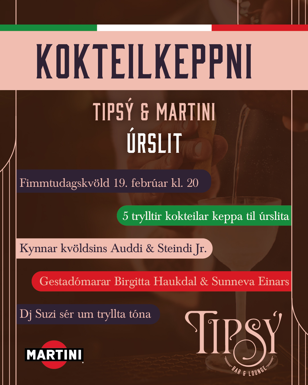 Úrslitakvöldið fer fram á Tipsý Bar fimmtudagskvöldið 19. febrúar klukkan 20.00. Þar munu hæfileikaríkir barþjónar etja saman kröftum og reyna að heilla bæði dómnefnd og gesti með útsjónarsemi, fagmennsku og framsetningu.