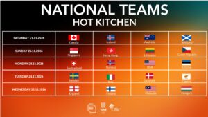 Í landsliðsflokki (National Teams) keppir íslenska landsliðið í Hot Kitchen laugardaginn 21. nóvember, en síðan í Chef’s Table þriðjudaginn 24. nóvember .