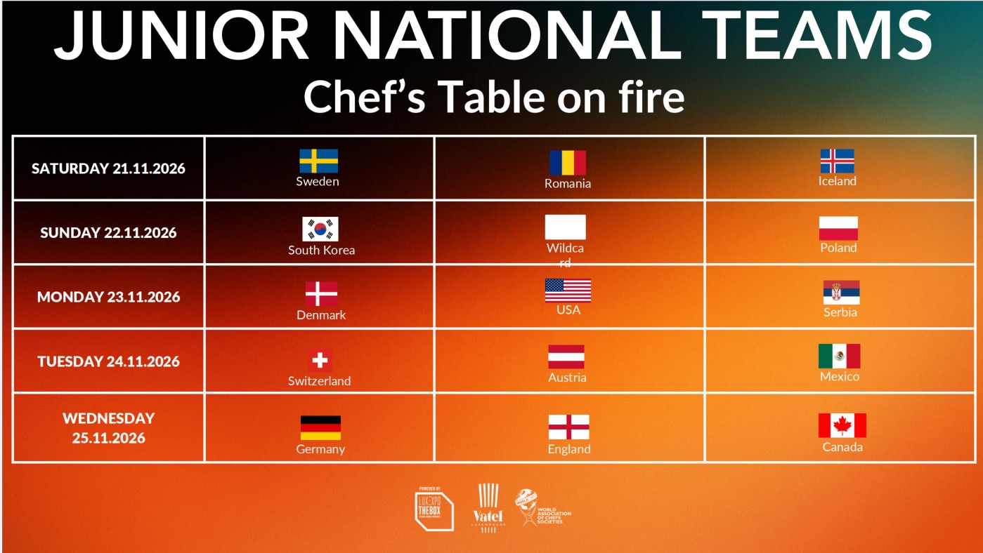 Í junior landsliðsflokki keppir íslenska liðið í Chef’s Table on Fire laugardaginn 21. nóvember og síðan í Hot Kitchen mánudaginn 23. nóvember .