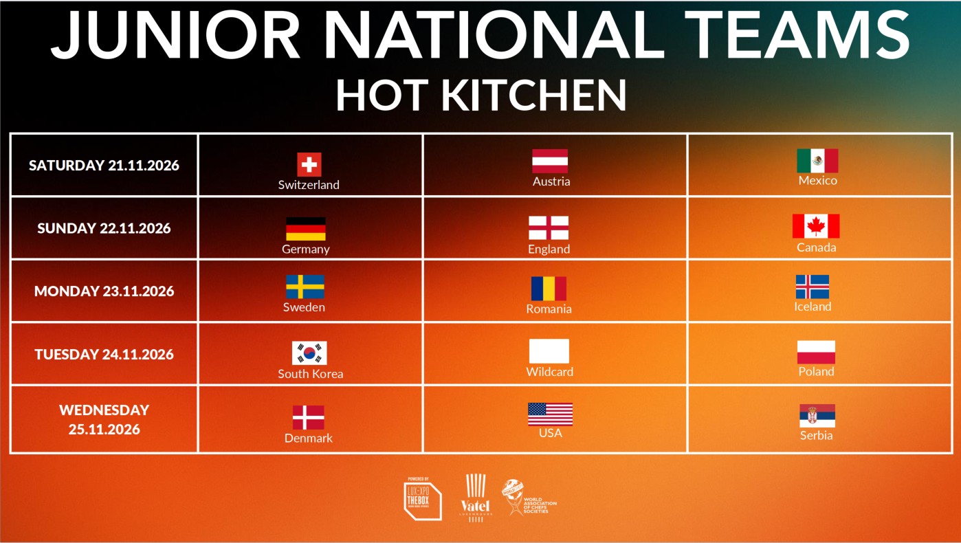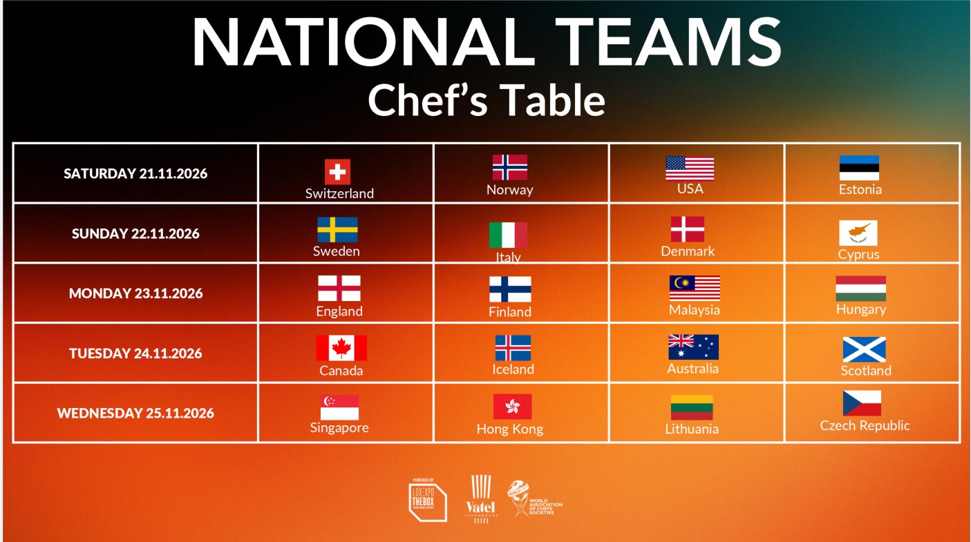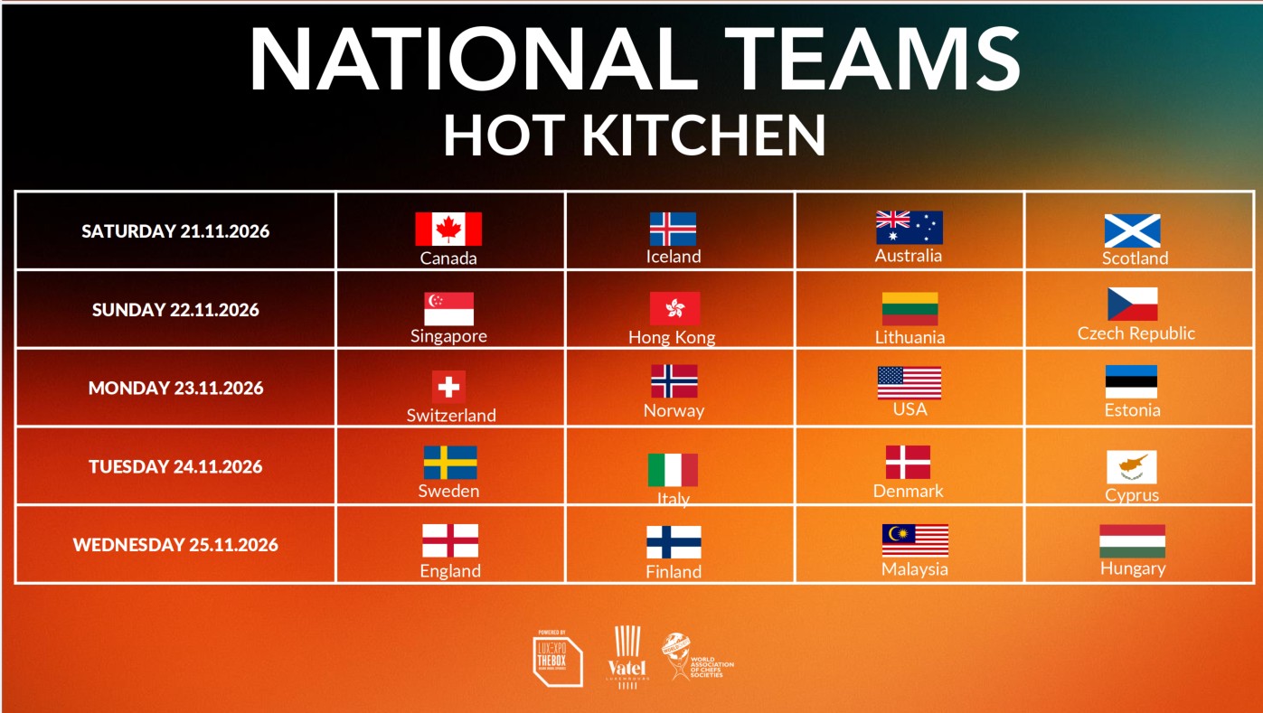 Fyrst til að stíga inn í búrið í landsliðsflokki í Hot Kitchen er Kanada, en Sviss ríður á vaðið í Chef’s Table . Bæði íslensku liðin hefja keppni á fyrsta keppnisdegi. Junior-liðið keppir í Chef’s Table on Fire, þar sem Ísland verður þriðja liðið til að stíga inn í búrið . Landsliðið byrjar einnig á sama degi í Hot Kitchen og verður annað liðið til keppni þann dag, að því er fram kemur í tilkynningu frá Klúbbi Matreiðslumeistara.