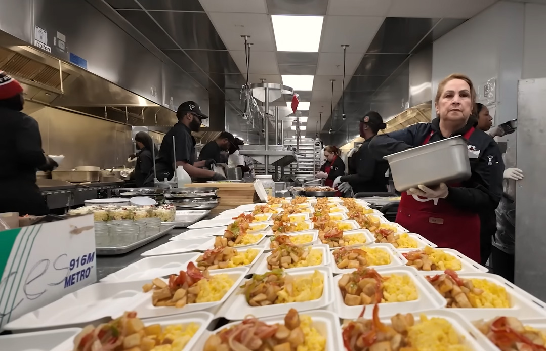 Eldhúsin á Mercedes-Benz Stadium eru í raun heill veitingabær. Þar eru starfrækt fjölmörg eldhús og sölustöðvar sem saman þurfa að framleiða tugþúsundir skammta á örfáum klukkustundum. Samkvæmt myndbandinu er eldað fyrir allt að 70.000 áhorfendur á leikdegi. Það krefst nákvæmrar áætlun, samhæfingar við birgja og stöðugrar endurnýjunar á hráefni. Matvælaflutningar hefjast snemma á morgni leikdags og flæði vörunnar inn á svæðið þarf að ganga snurðulaust fyrir sig þrátt fyrir að vellinum sé enn verið að umbreyta.