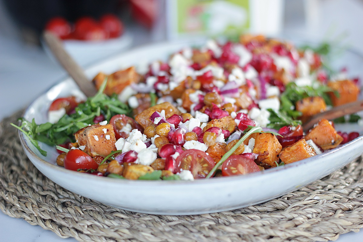 Setjið sætkartöflublönduna ofan á ásamt niðurskornum tómötum, rauðlauk og granatepli.