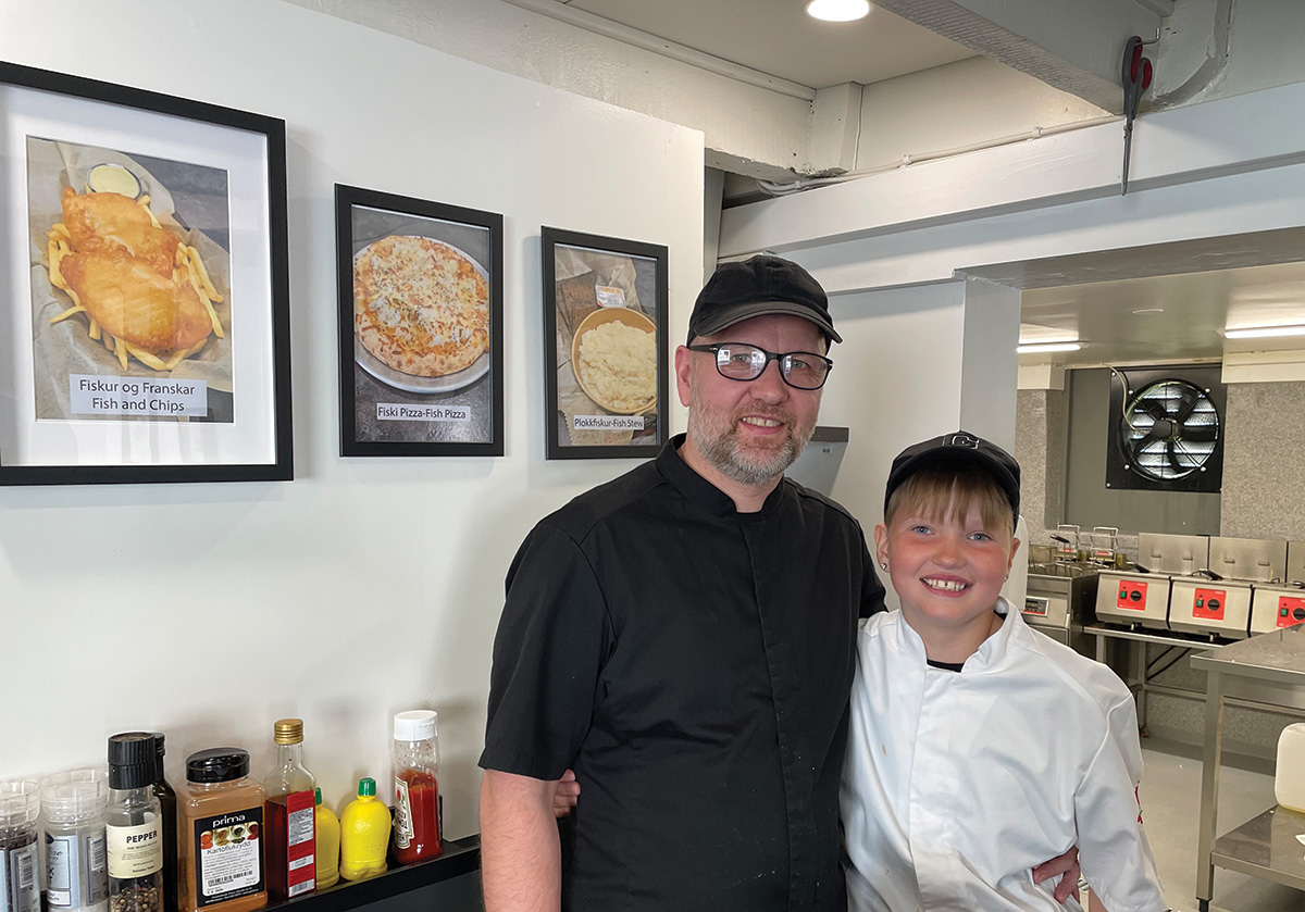 Feðgarnir á vaktinni: Hákon Sæmundsson matreiðslumaður ásamt syni sínum í eldhúsi Fiskbúðar Fjallabyggðar.