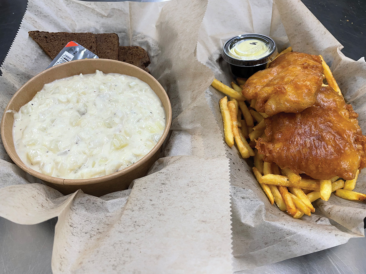 Vinsælasti rétturinn meðal gesta er klassískur Fish & Chips, en einnig má finna á matseðlinum plokkfisk með rúgbrauði og smjöri, auk fiskipizzu – allt eldað frá grunni og með áherslu á hráefni úr héraði.