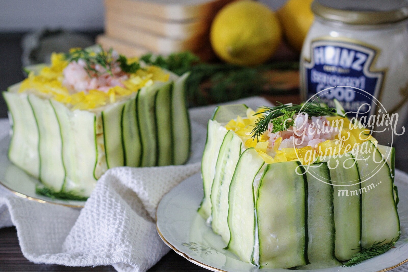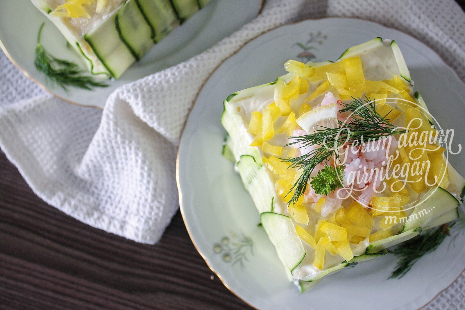 6 – Skerið agúrku í sneiðar og raðið utan um brauðterturnar. Annars er hægt að skreyta þær með hverju sem ykkur dettur í hug. Ég notaði agúrkur, saxaðar rækjur, ferskt dill og saxaða gula papriku.
