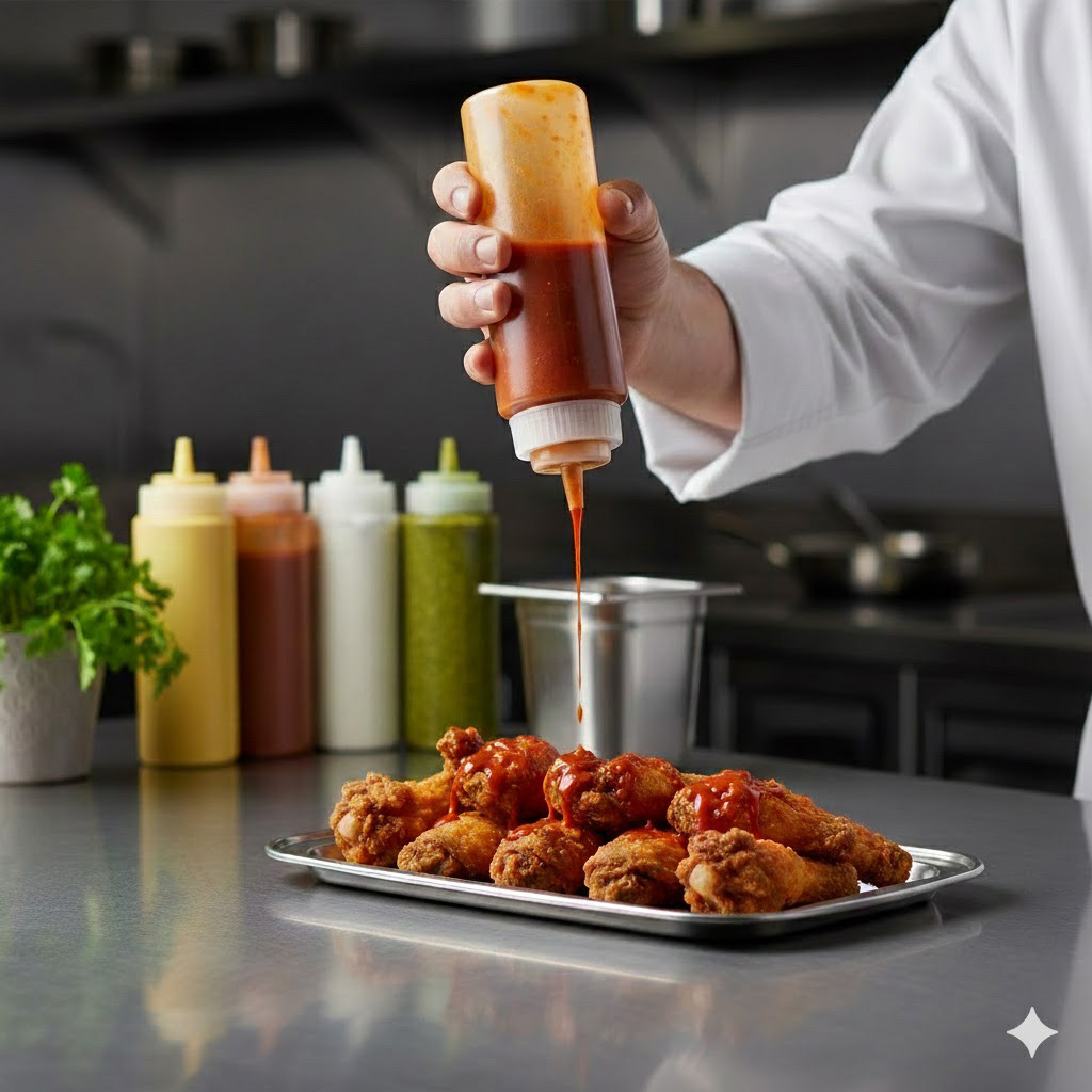 Hægt er að velja um mismunandi stúta, þar á meðal þriggja-stúta útfærslu sem tryggir fljótlega og jafna dreifingu á sósum og skrauti, sem sparar dýrmætan tíma við lokaskref framreiðslunnar. Flöskurnar fást í nokkrum litum og stærðum, sem auðveldar flokkun og skipulag á vinnustöðvum.