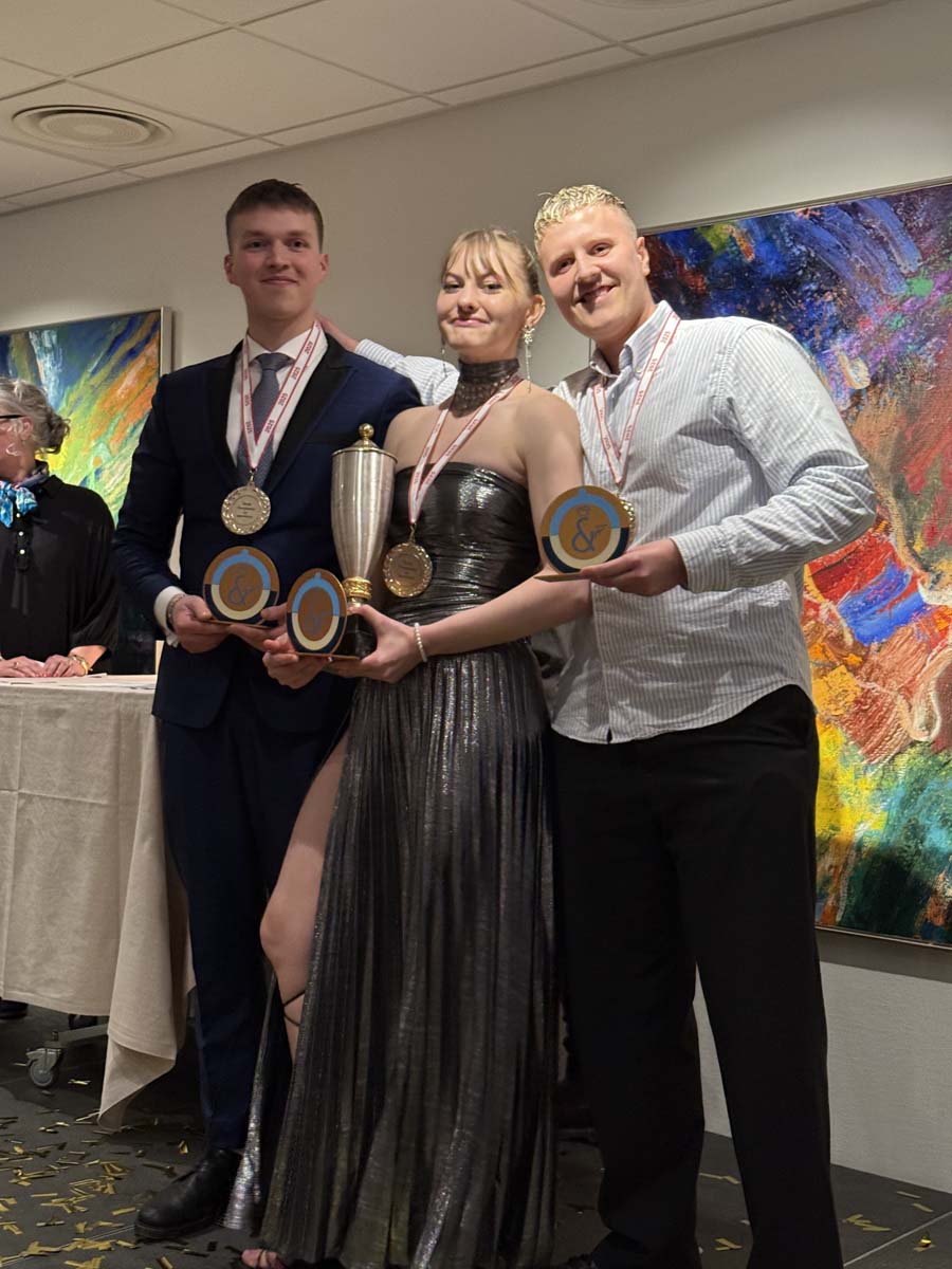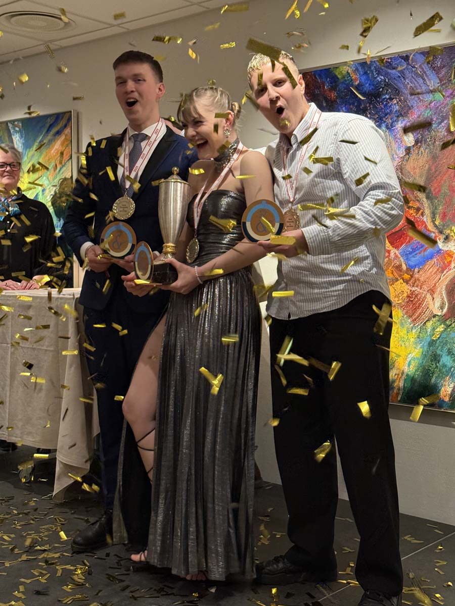 Tristan Tómasson Manoury, Silvia Louise Einarsdóttir og þjálfarinn Finnur Gauti Vilhelmsson fögnuðu sigrinum vel og innilega