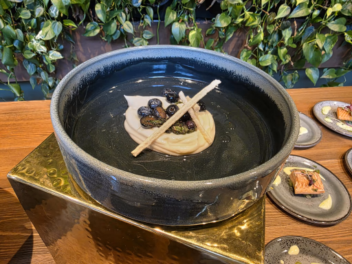Í forrétti er léttreyktur þorskur borinn fram með sellerírót, bæði súrsaðri og maukaðri, ásamt grilluðu grænkáli. Réttinum fylgir létt froðukennd sósa úr kryddjurtum og hvítvíni.