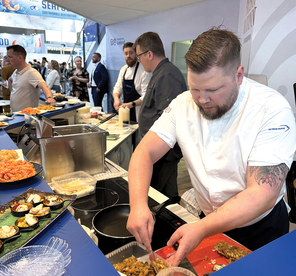 Eins og fyrr segir er bás Samherja og Ice Fresh Seafood stór og vel búinn. Einar Geirsson matreiðslumeistari og eigandi veitingastaðarins RUB 23 á Akureyri hefur í tvo áratugi haft yfirumsjón með matreiðslu á básum Samherja og Ice Fresh Seafood um víða veröld.