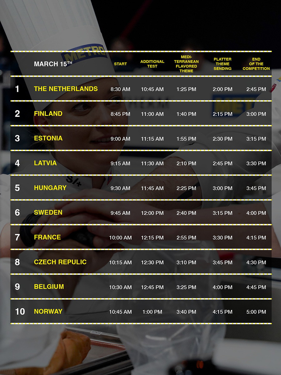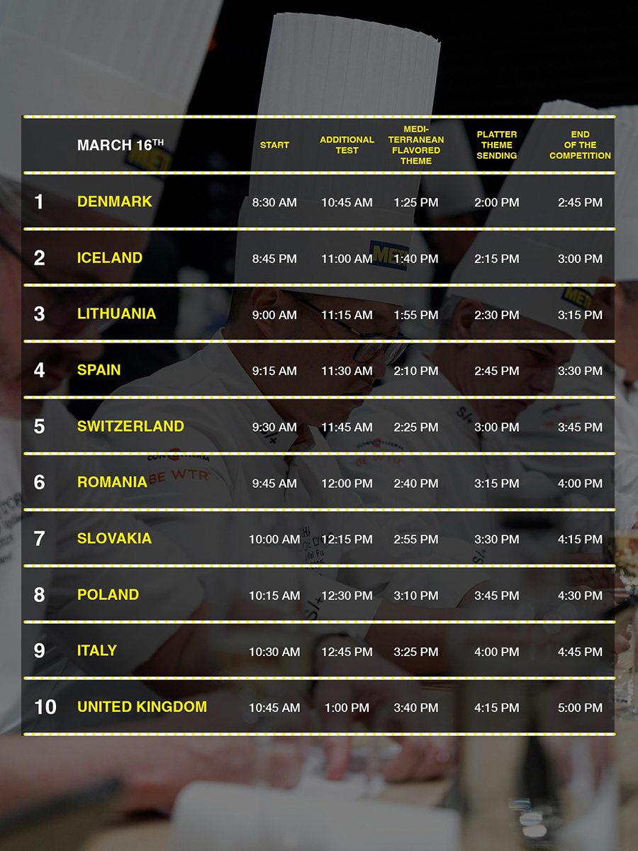 Keppnisdagarnir eru byggðir upp með strangri tímastýringu. Fyrst hefst keppnin með undirbúningi, þar á eftir kemur diskurinn sem byggir á sérstöku Miðjarðarhafsþema, áður en lokaverkið, fatið, er sent til dómnefndar. Keppnisdagur hvers liðs spannar rúmlega sex klukkustundir þar sem hvert smáatriði skiptir máli.