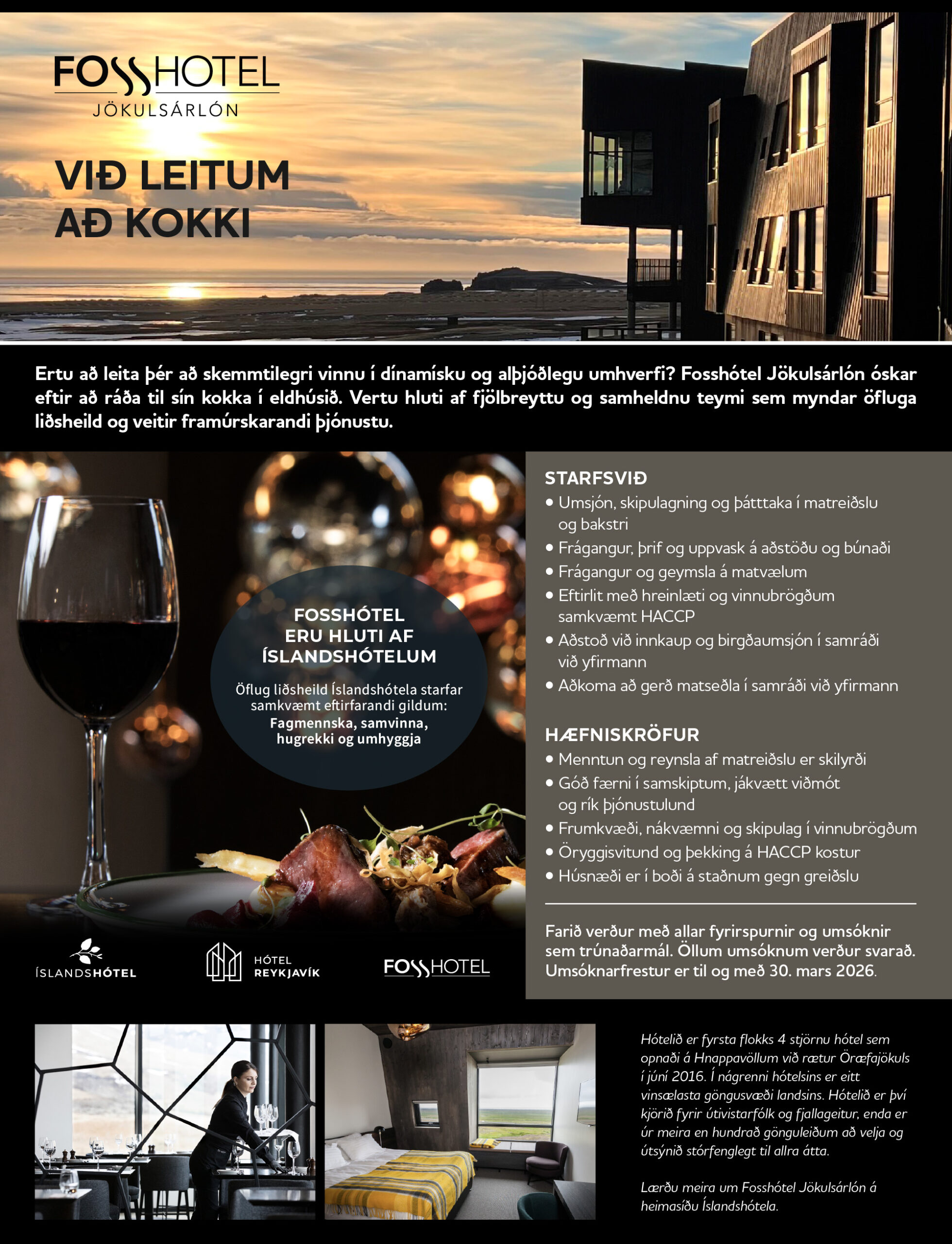 Kokkur óskast á Fosshótel Jökulsárlóni, fullt starf í einstöku umhverfi