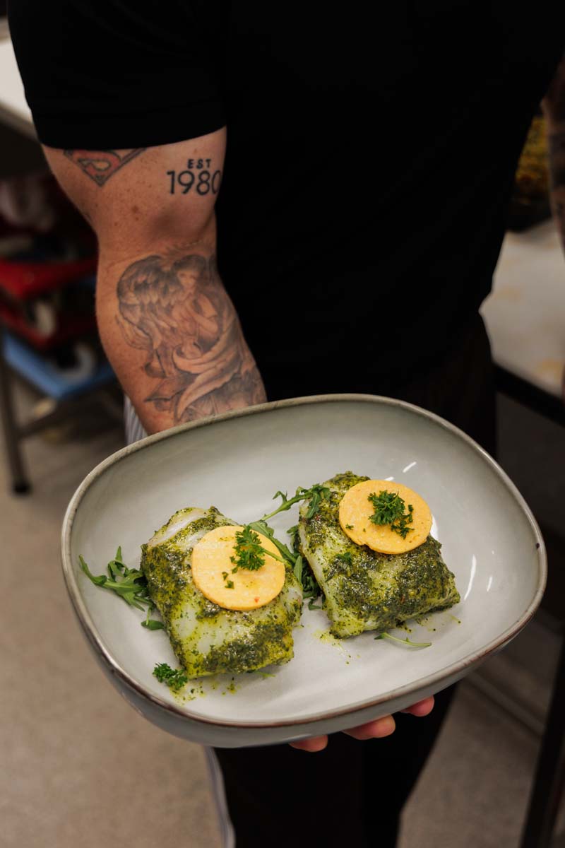 Guðmundur Birkir Pálmason, betur þekktur sem Gummi Kíró, heimsótti fiskverslunina Hafið í Hlíðasmára á dögunum og kynnti nýjan fiskrétt sem nefnist Bon appétit, sem hann hannaði í samstarfi við Hafið. Rétturinn samanstendur af þorskhnakka í hvítlauks- og kryddjurtamarineringu, borinn fram með sætkartöflu, aprikósupestó og sriracha-smjöri.