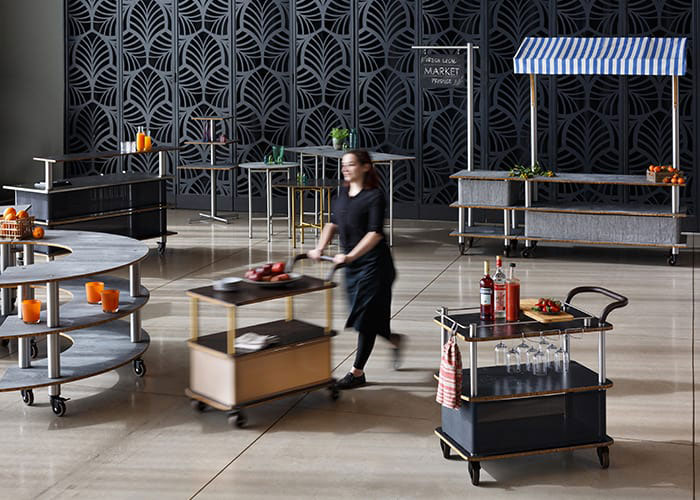 Grunnurinn í Mogogo hönnuninni býður upp á þannig möguleika að búa til margs konar útfærslur af hlaðborðum og barborðum t.a.m. Hægt er að þróa útfærsluna enn frekar með upphitunar- og eldunarstöðvum sem part af samsetningunni.