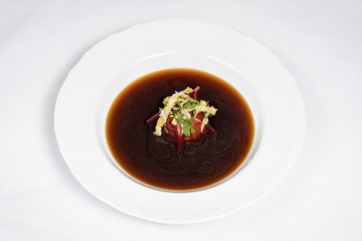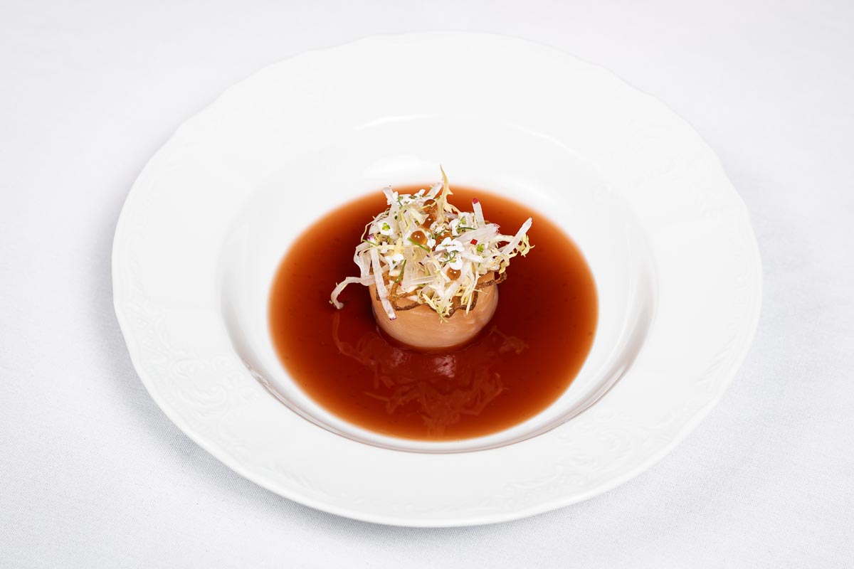 Kvöldið hófst á kombu jime grafinni bleikju ballontine með yuzu majónesi, lacto gerjaðri hindberja ponzu, rúg miso tuille, bleikjuhrognum og micro herb salati, í höndum Daníels Cochran Jónssonar, þjálfara Ungkokkalandsliðsins, sem starfar hjá Innnes. Rétturinn var léttur, ferskur og nákvæmur í bragði og opnaði máltíðina á fágaðan hátt.