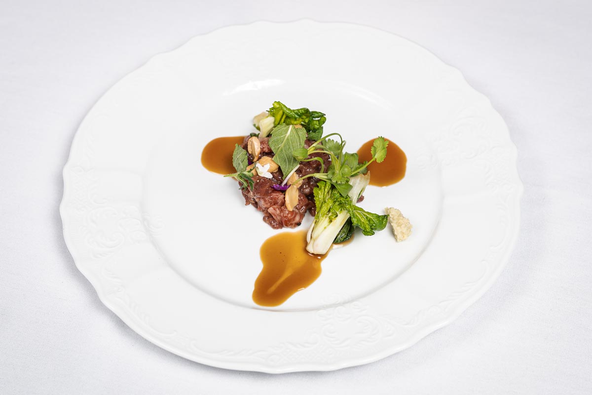 Wagyu nautatartar með íslensku wasabi, engifer, kasjú og sojasósu, í höndum Óskars Finnsonar hjá Finnson. Með réttinum var parað Gustave Lorentz Riesling Grand Cru Altenberg de Bergheim 2020 frá Alsace í Frakklandi, þurrt, steinefnaríkt og flókið vín með ferskjum, bergamot og elduðum sítrónum.