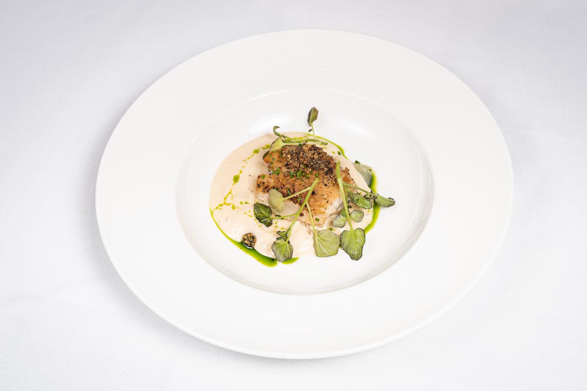 Grillaður og gljáður karfi með bláskel espuma, poppuðu hirsi og grilluðum og sýrðum fennel, eldaður af Hafsteini Ólafssyni frá ION Hóteli.