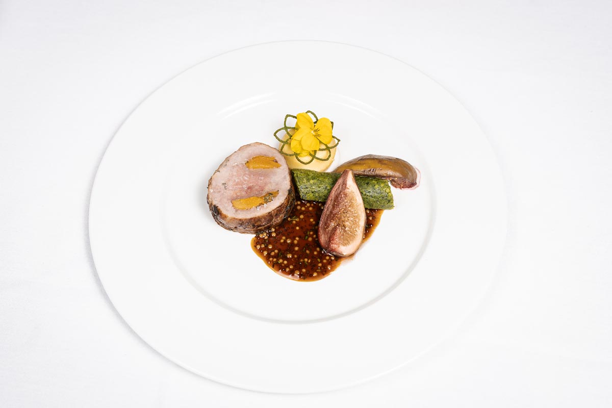 Fyllt lambafillet með apríkósum og blóðbergi, jarðskokkum purée, rauðvínssoðinni fíkju, svartrót gratin með parmesan og lambasoðgljáa, í höndum Stefáns Elí Stefánssonar frá KH Veitingum.
