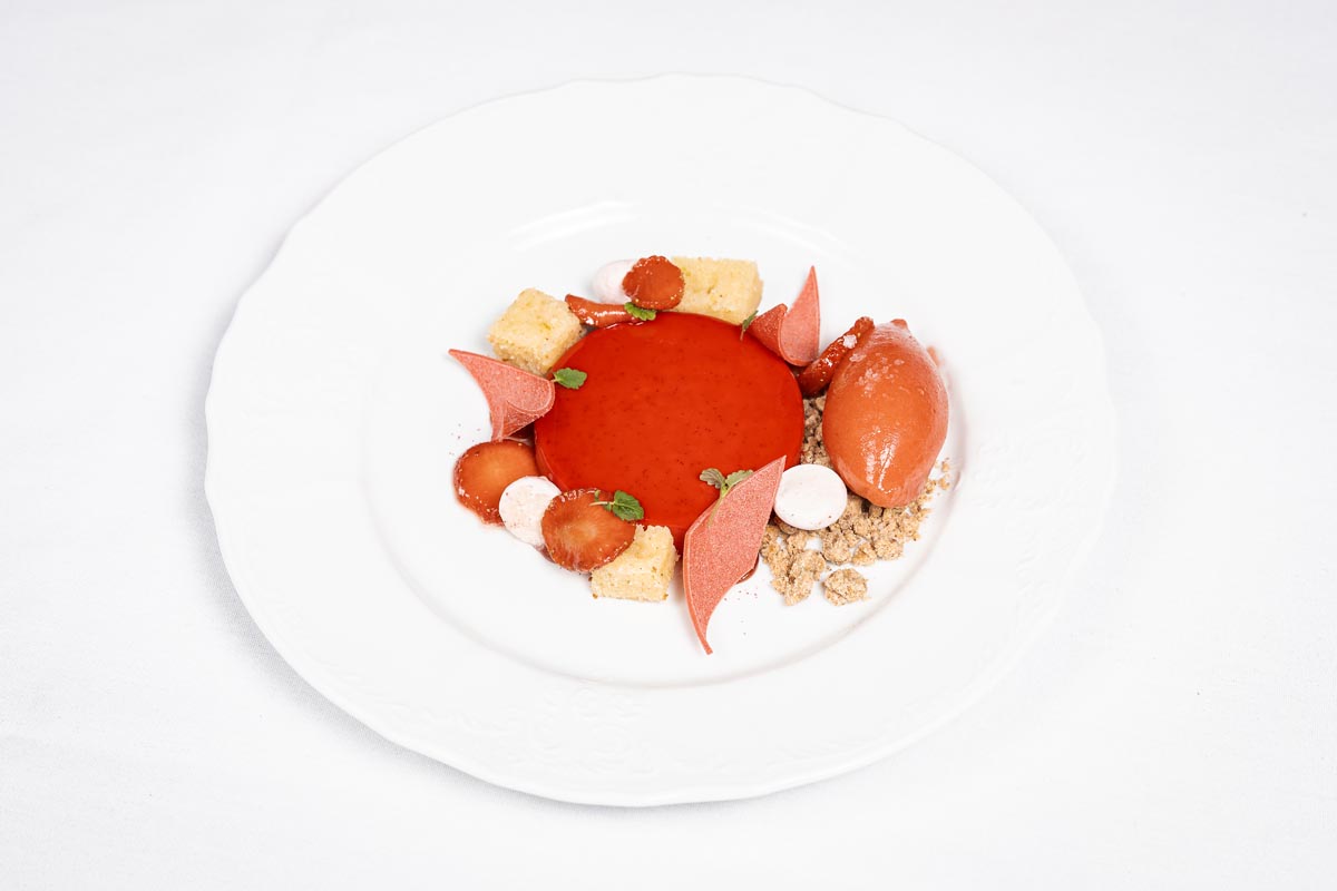 Hvítsúkkulaði, skyr og vanillumús með vanilluólífuolíuköku, jarðarberjum, yuzu gelkremi, pikkluðum jarðarberjum og rabarbara var í höndum Axels Þorsteinssonar frá Hygge Kaffi og Bakarí.