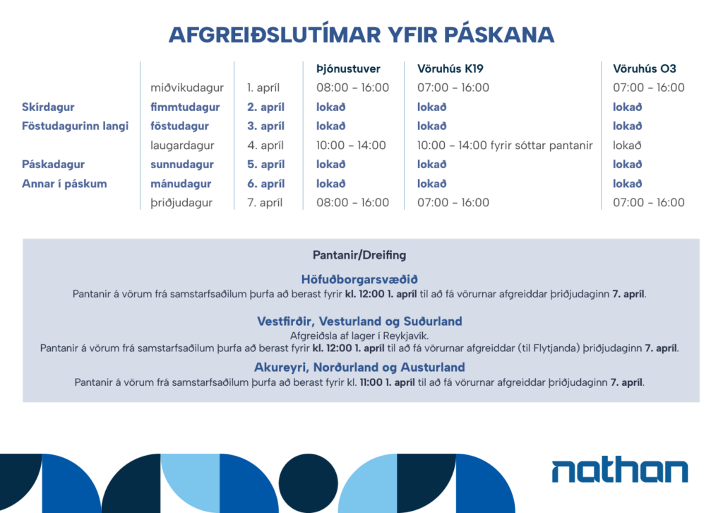 Í töflunni hér að neðan getið þið kynnt ykkur opnunar- og afgreiðslutíma þjónustuvers og vöruhúsa Nathan yfir páskana 2026.