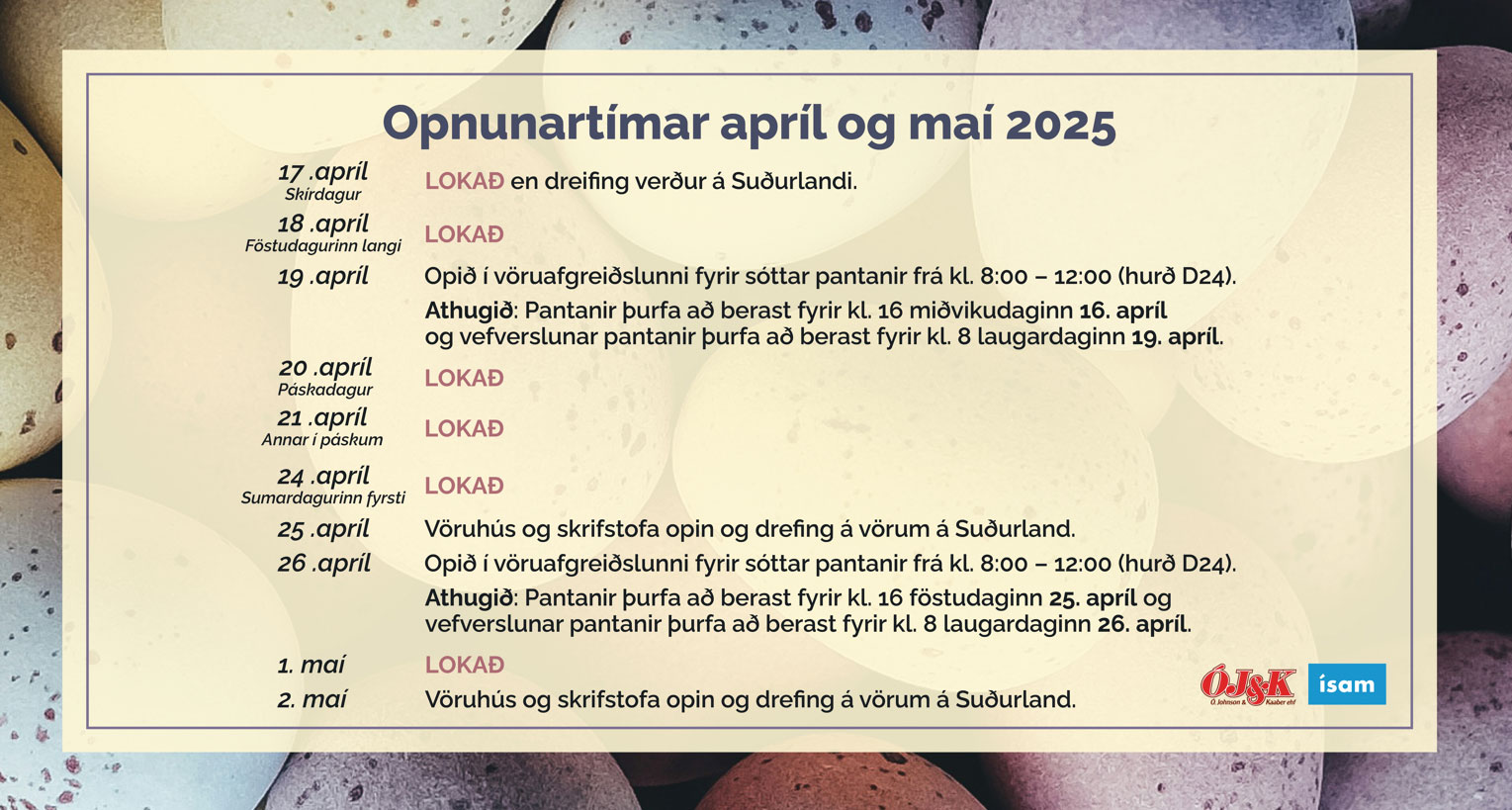ÓJ&K-ÍSAM – Opnunartímar apríl og maí 2026