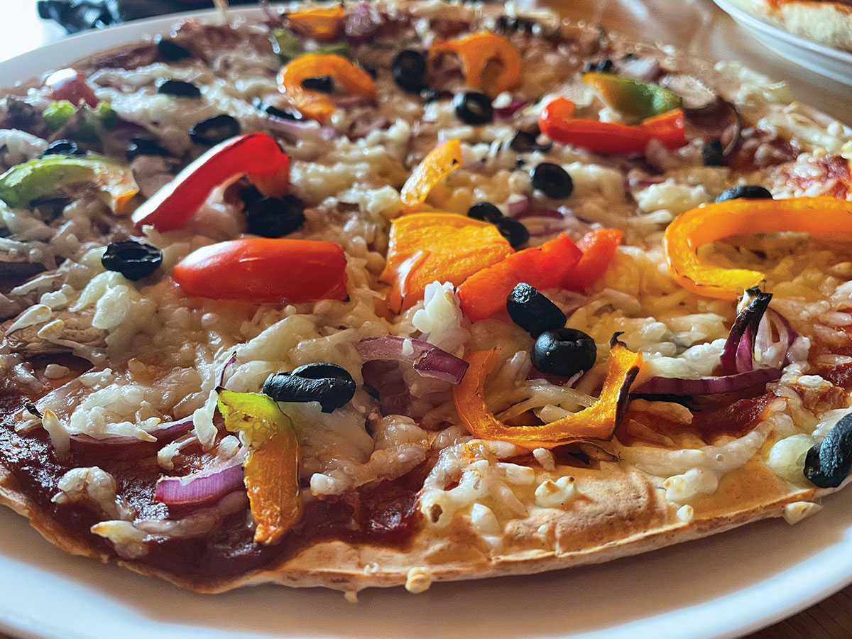 Vegan pizzan (12″, 5.050 kr.) með vegan osti, papriku, rauðlauk, svörtum ólífum og sveppum var einstaklega góð, þunnur, glútenlaus botn sem hélt sér vel og hafði ljúffengan keim.