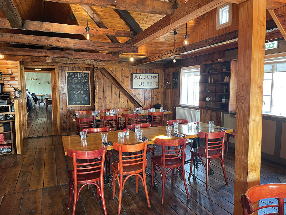 Flottur veitingastaður, en þar ríkir hlý og notaleg stemning sem endurspeglar bæði sögu byggingarinnar og metnað í matargerð.