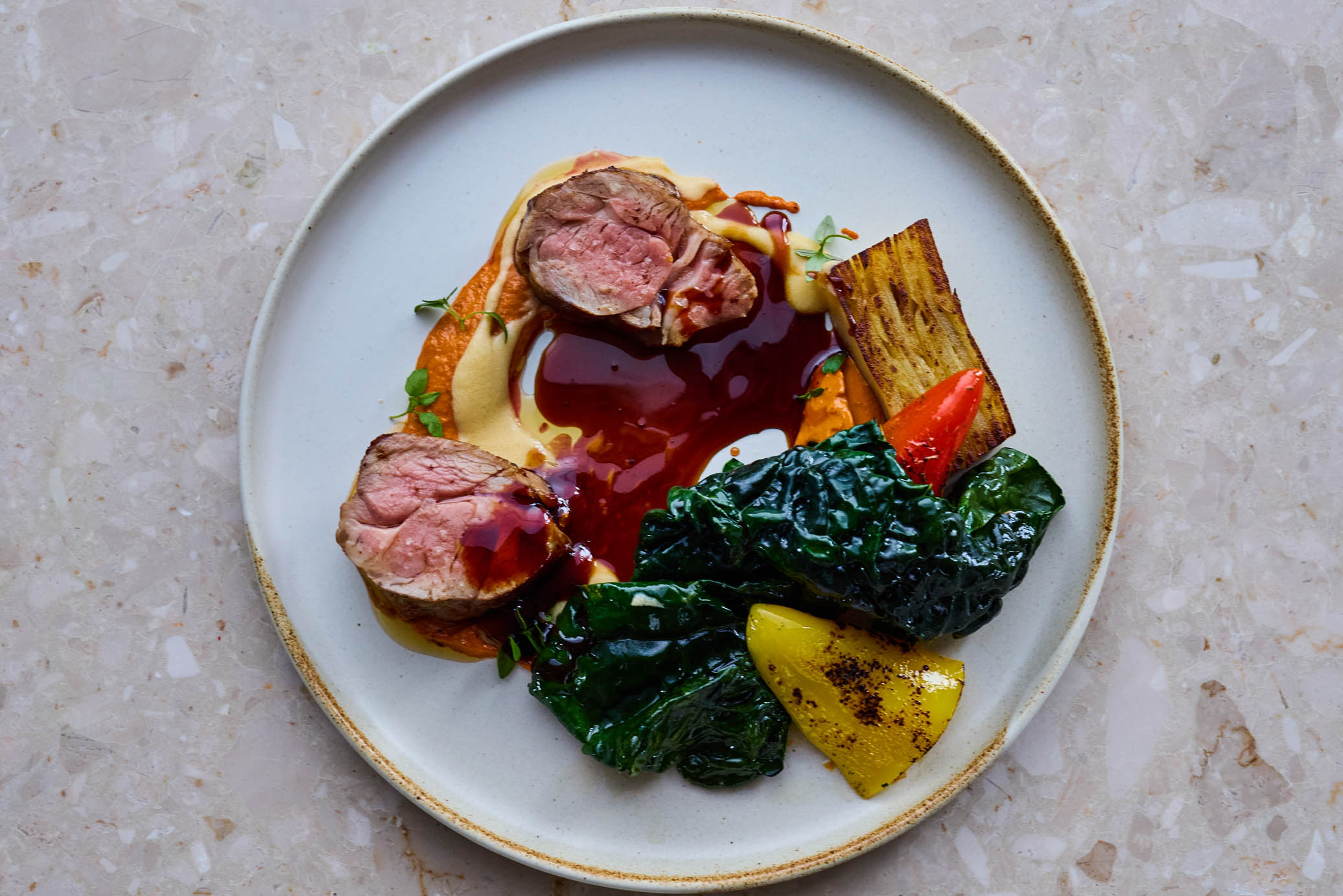með grillaðri papriku, feyki, kartöflukrókettu & soðsósu með heslihnetum